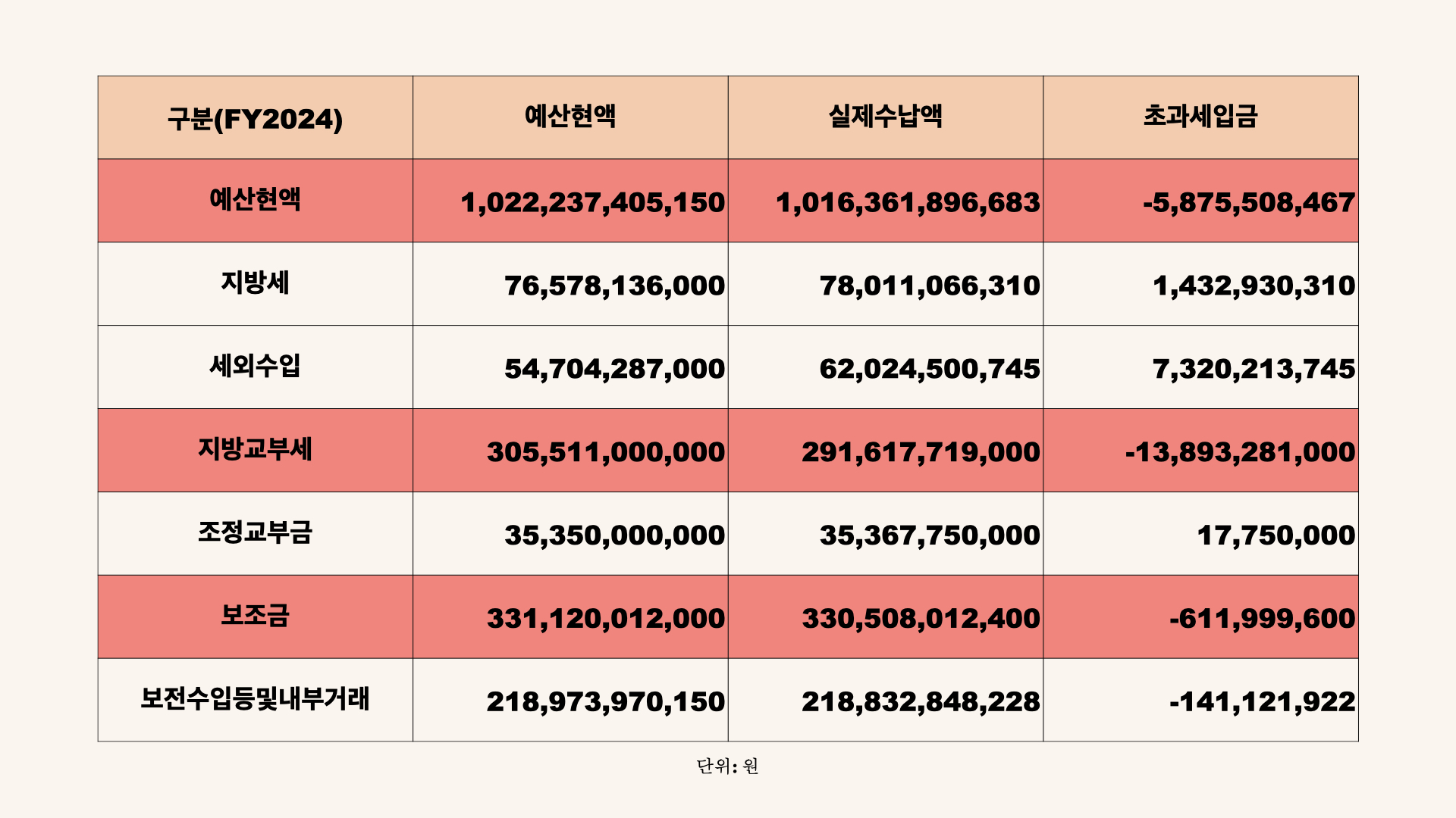 불길한 예감은 틀리지 않습니다. 2024년 홍성군이 예측한 세입은 약 1조원이었는데, 실제 들어온 세입은 약 58억원이 적자였습니다. 주민세 및 재산세 등으로 구성된 지방세는 예측보다 14억원을 더 많이 거두었고, 행정재산 임대료 및 사용료, 과태료 등으로 구성된 세외수입도 무려 73억원이나 더 많이 수납되었습니다. 그런데 문제는 국세 감소 여파로 홍성군의 자주재원인 지방교부세가 무려 138억원이나 적게 교부되었습니다. |