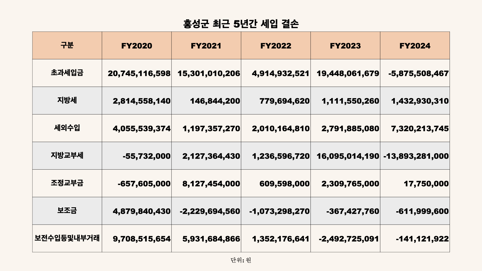 이런 현상은 매우 이례적인 상황입니다. 최근 5년 간 홍성군의 세입 결손을 살펴보면, 2024년도를 제외하고는 단 한 차례도 세입이 결손된 적이 없기 때문입니다. 가령, 2020년에는 초과 세입이 200억원에 달하기도 했습니다. |