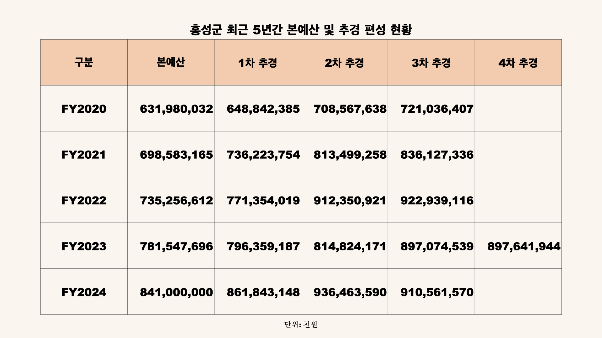 일반적으로 홍성군을 포함한 자치단체는 연 초에 본예산을 최대한 적게 편성하고, 연중 추경에서 그 해에 사용할 예산을 추가로 증액합니다. 그리고 마지막 추경에서는 한 해 사용한 예산을 실제에 맞게 예산서와 맞추는데요, 이를 정리 추경이라고도 합니다. 그런데 홍성군은 최근 5년 간 마지막 추경에서 직전 추경 대비 예산이 줄어든 적이 없는데, 2024년의 경우 약 250억원 규모의 감액 예산을 편성을 합니다.