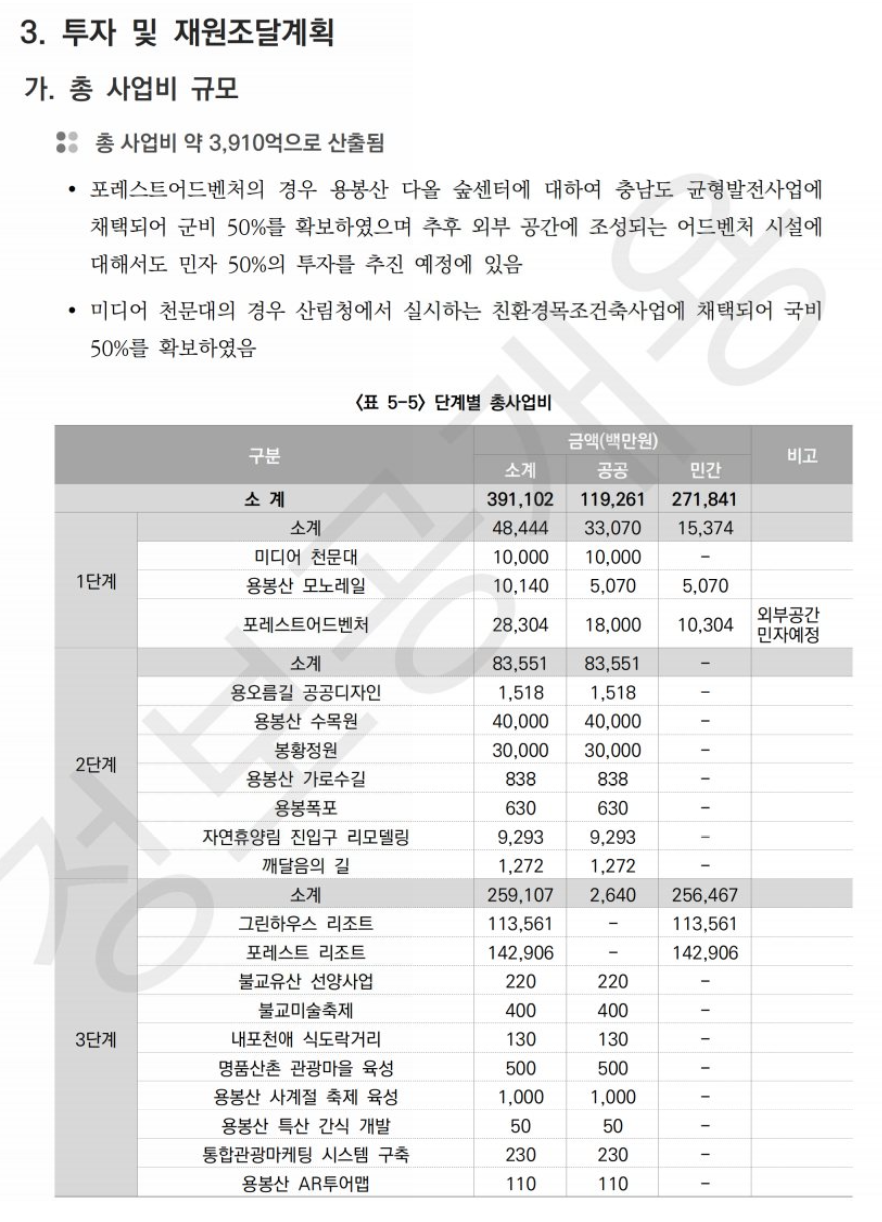 용봉산 개발 총 사업비 약 4천억원 중 약 1,200억원은 홍성군에서 투입하고 약 2천 7백억은 민간 투자를 유치해서 추진한다는 것이 홍성군의 입장입니다. 이에 따라 모노레일 사업의 절반과 포레스트어드벤처 사업 일부 그리고 그린하우스 리조트 및 포레스트 리조트 사업은 전액 민간 투자 유치로 진행됩니다. |
