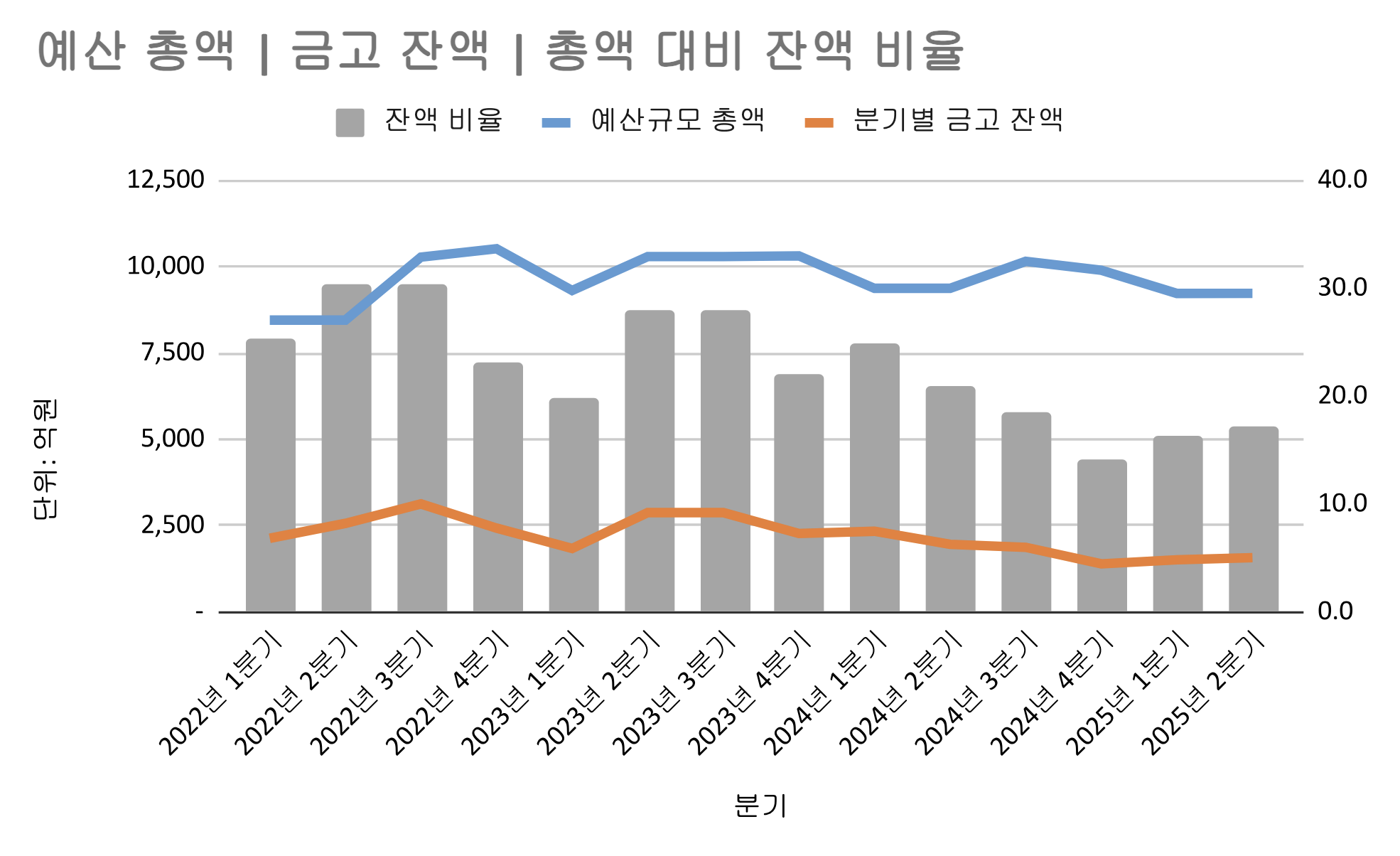 위 그림은 최근 4년 내 홍성군의 예산 총액과 금고의 잔액입니다. 금고 잔액이란 쉽게 이야기하면 홍성군 통장(계좌)에 들어있는 돈입니다. 현재 군수인 이용록 군수가 취임하는 2022년 3분기에 홍성군의 예산 지출 규모는 직전 분기 약 8,500억원 수준에서 1조원 수준으로 급증합니다. 하지만 금고 잔액도 약 3,000억원으로 증가해 예산 대비 잔고 비율이 30%였습니다. 그런데 3년 만인 2025년 2분기 홍성군 잔고는 약 1,500억원 수준으로 감소했습니다. 예산 총액 대비 잔액 비율은 17%로 급락합니다.