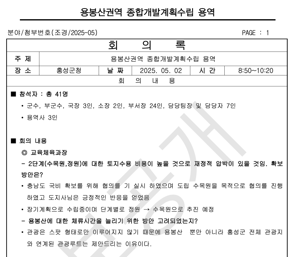 종합하면, 용봉산 개발 계획은 2026년부터 10년간 용봉산 일대를 망가뜨리고 예산을 흥청망청 쓰겠다는 못된 계획입니다.