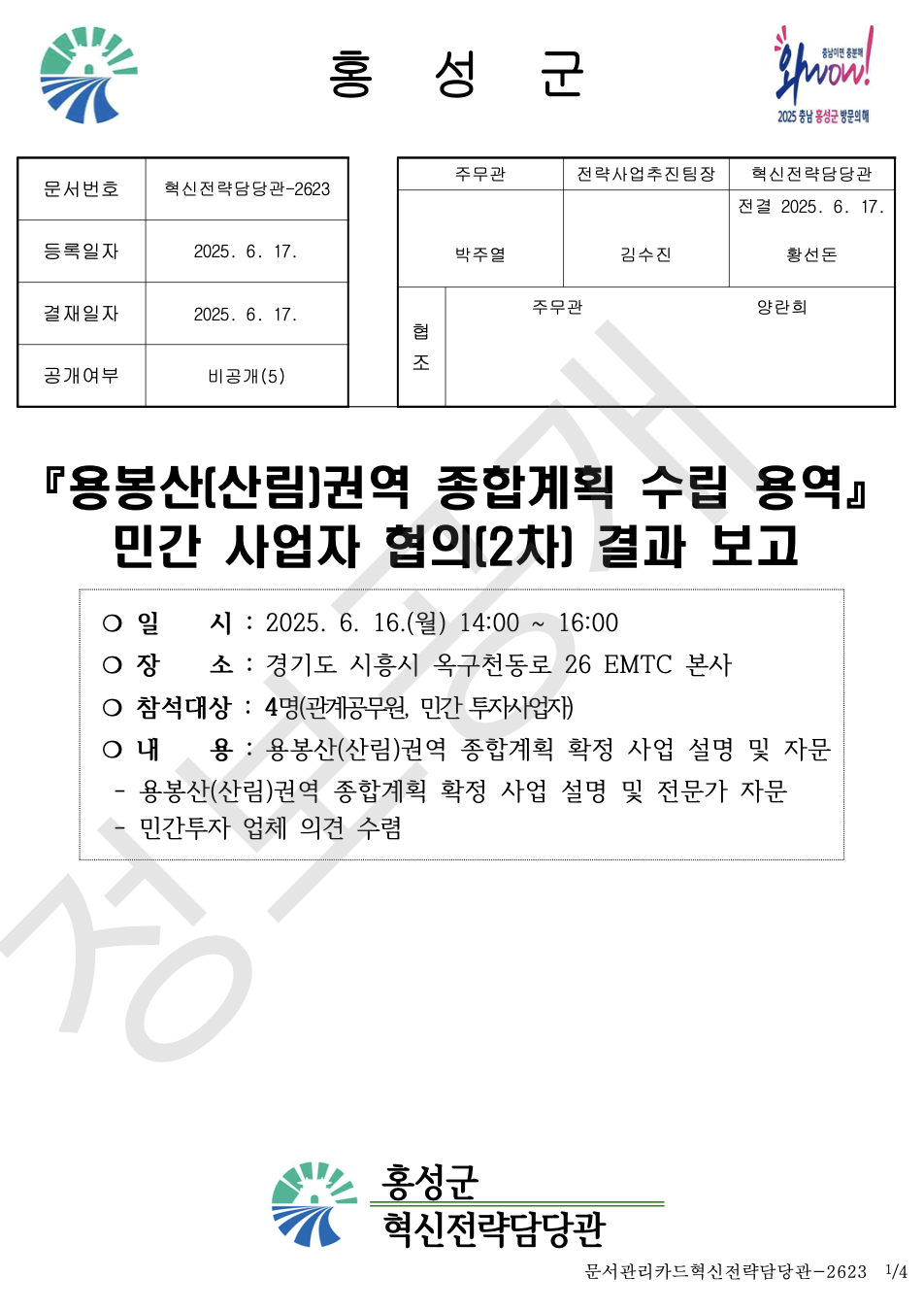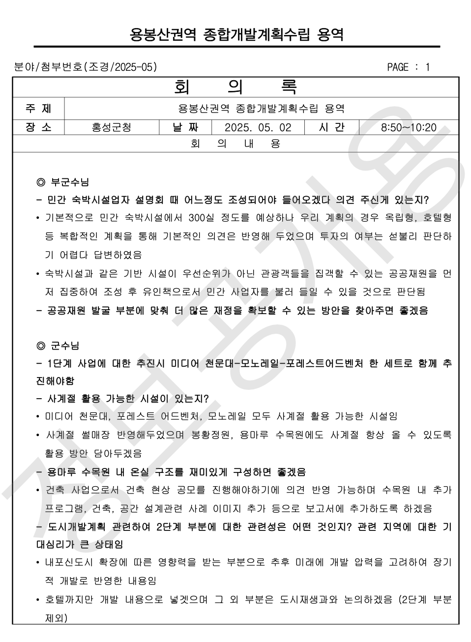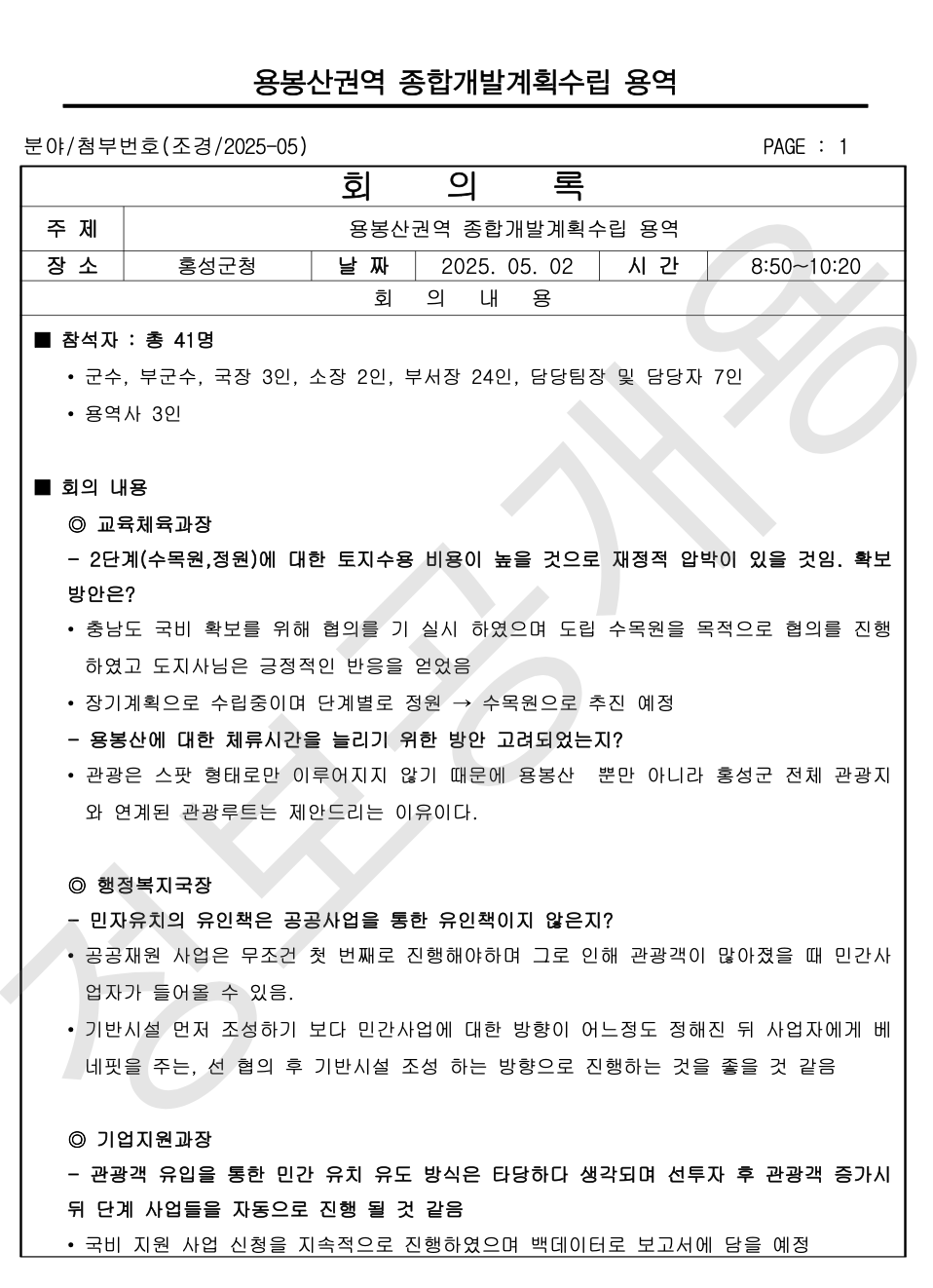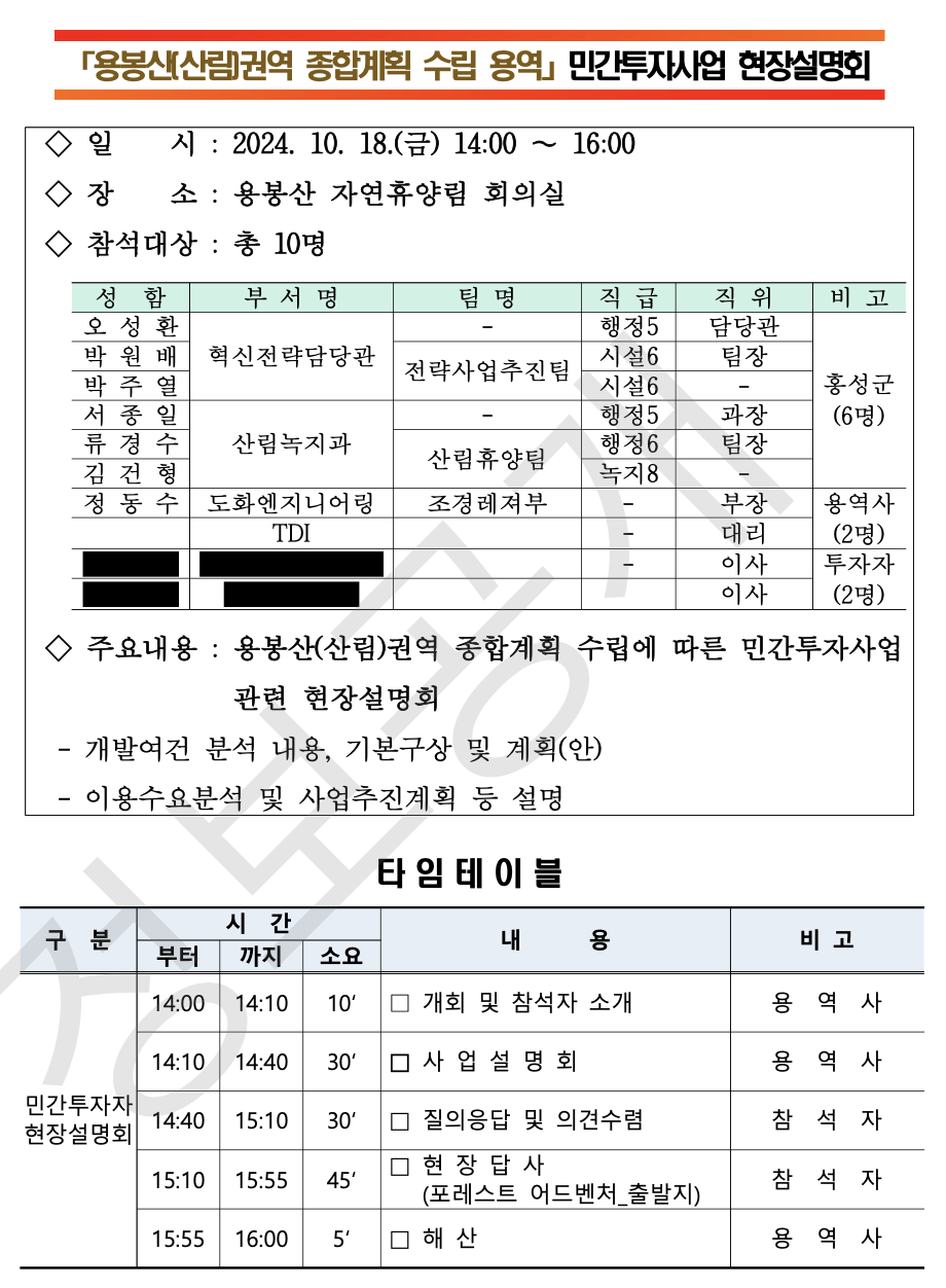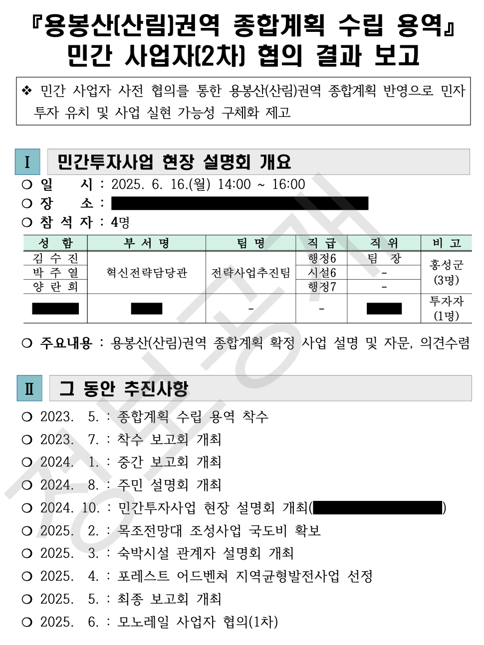 홍성군이 어떤 사업자를 만났는지 비공개해서 누구를 만났는지는 알 수 없습니다. 다만 2024년 10월 설명회에서 답사 협장을 "포레스트 어드벤처_출발지"라고 기재한 점(출발할게 뭐가 있을까요?), 2025년 6월 설명회에서 추진 사항 맨 마지막 줄에 "모노레일 사업자 협의(1차)"라고 기재한 점을 보면 모노레일 사업자 민간투자 설명회를 한 것으로 추정됩니다. |